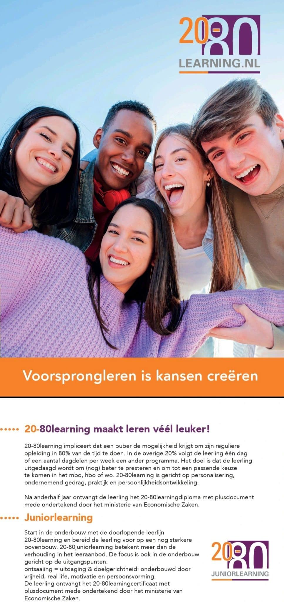 Jij krijgt uitdagend onderwijs gericht op jouw toekomst en jij komt op voorsprong! Ex-20-80learners vertonen significant minder uitval. Uiteraard zullen er nog meer factoren zijn, die daarbij een rol spelen; maar toch is het een mooie bijvangst!