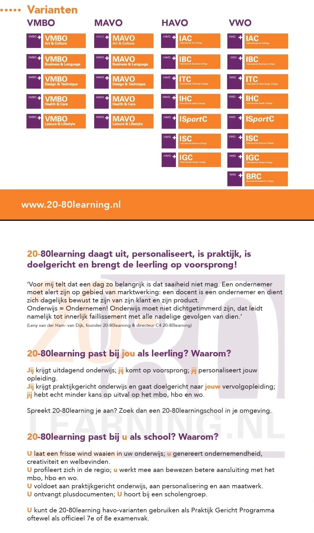 Als 20-80learningschool geniet u regionale en landelijke bekendheid: de VO-Raad, de Vereniging Hogescholen, het ministerie van EZ, de politiek en de Inspectie VO kennen het concept vanaf 2008 en staan achter de mogelijkheden en de uitvoering van deze onderwijsvernieuwing.